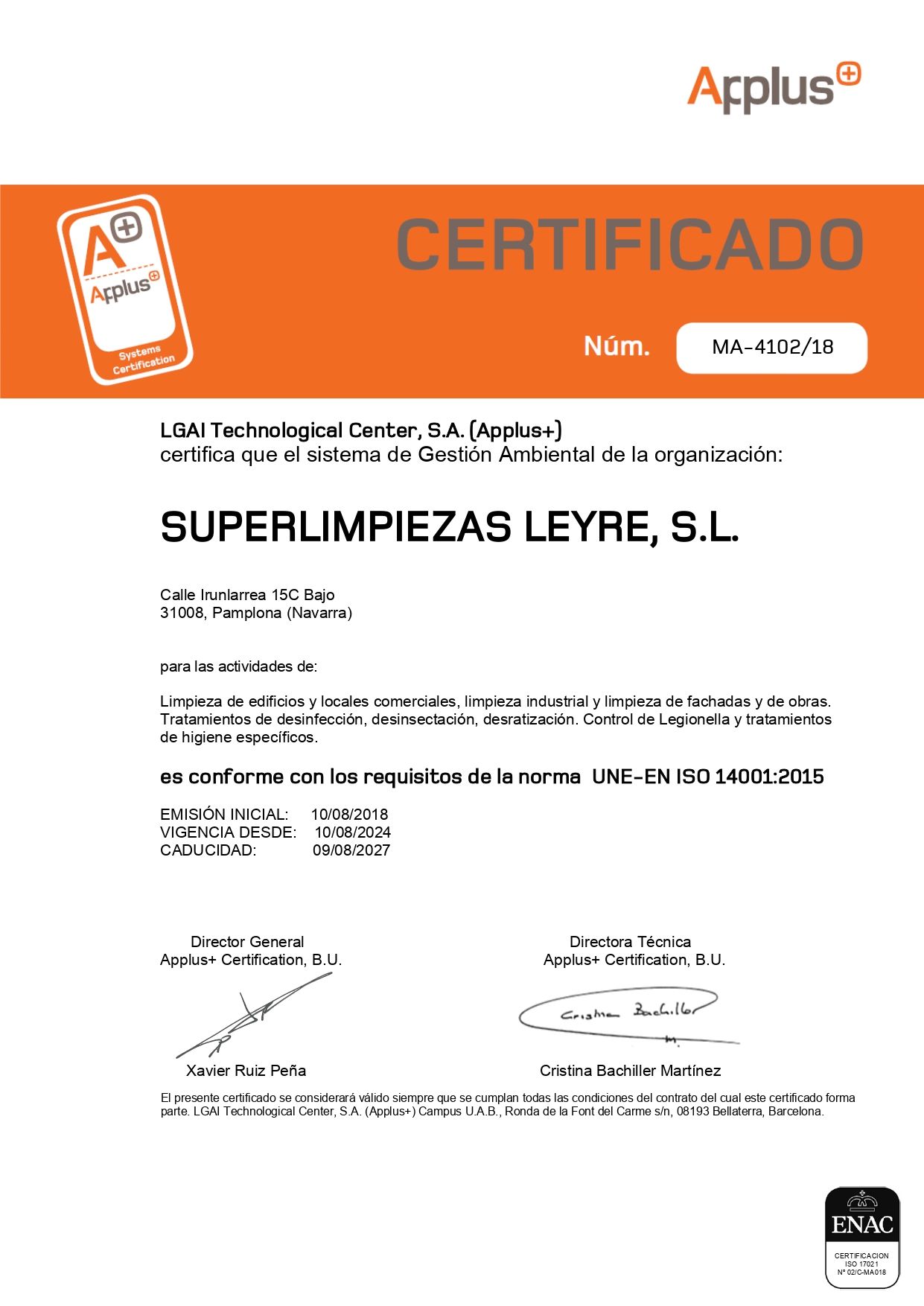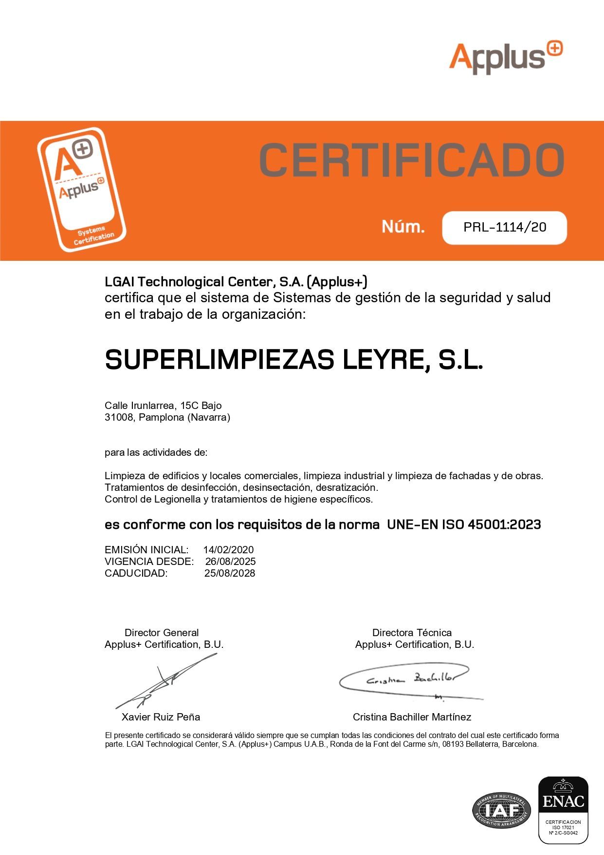 SuperLimpiezas Leyre, S.L. es una empresa de Sanidad Ambiental registrada en el Registro Oficial de Establecimientos y Servicios Plaguicidas rama B con el número S-B-01-4-NA y por lo tanto está autorizada para aplicar y nebulizar biocidas y viricidas, productos autorizados por el Ministerio de Sanidad , para la desinfección y eliminación del coronavirus COVID-19 , así como para emitir informes y certificados de desinfección